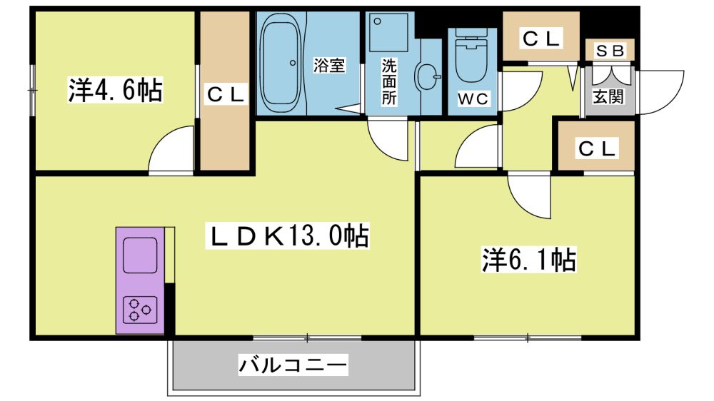 2LDK( LDK13畳/洋室6.1畳/洋室4.6畳 ) |